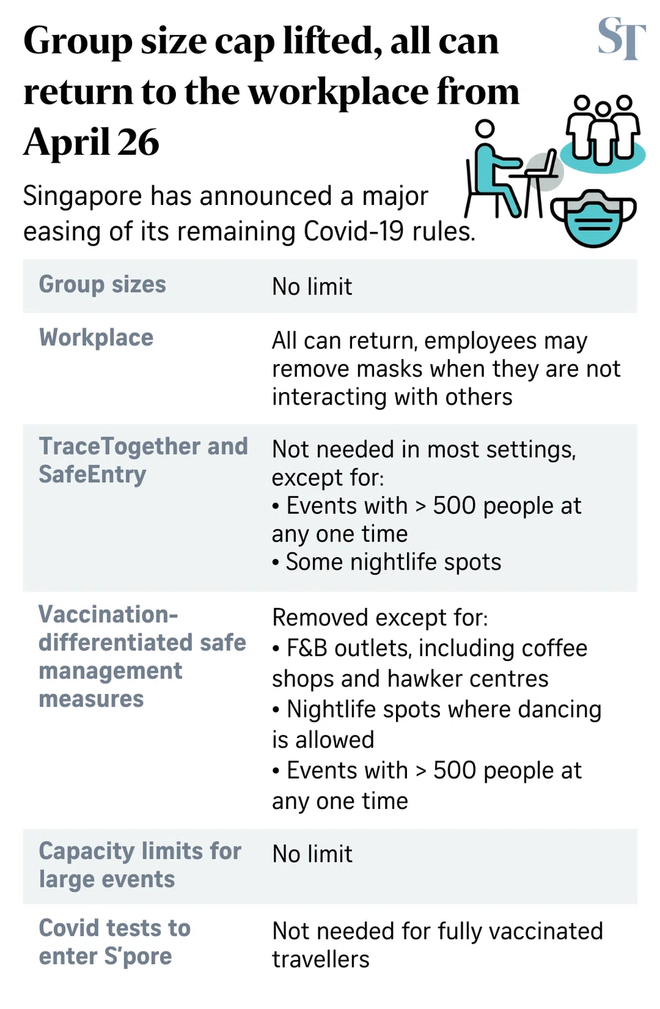 Under the latest Covid-19 measures in Singapore, there is no longer a capacity or group size limit for social gatherings, classes, events and more. Safe distancing will also no longer be required between individuals or between groups, both indoors and outdoors.