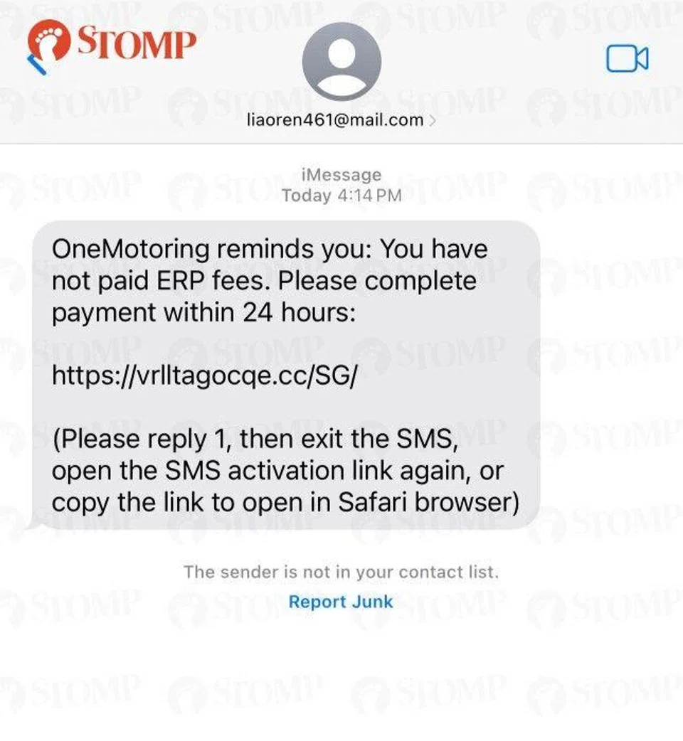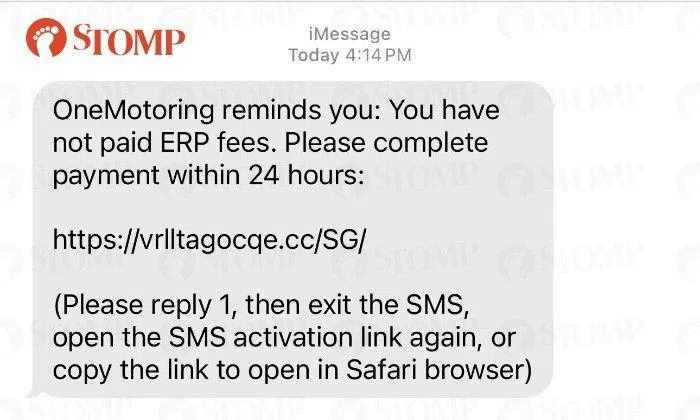 A Stomper who received an SMS to pay Electronic Road Pricing (ERP) fees within 24 hours wants to warn others about it.