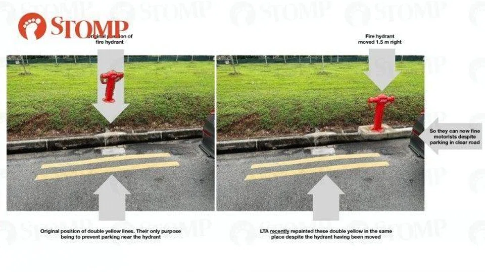 He pointed out that the hydrant was recently moved 1.5m, but the yellow lines in front of the hydrant were not, reported Stomp on Nov 6.