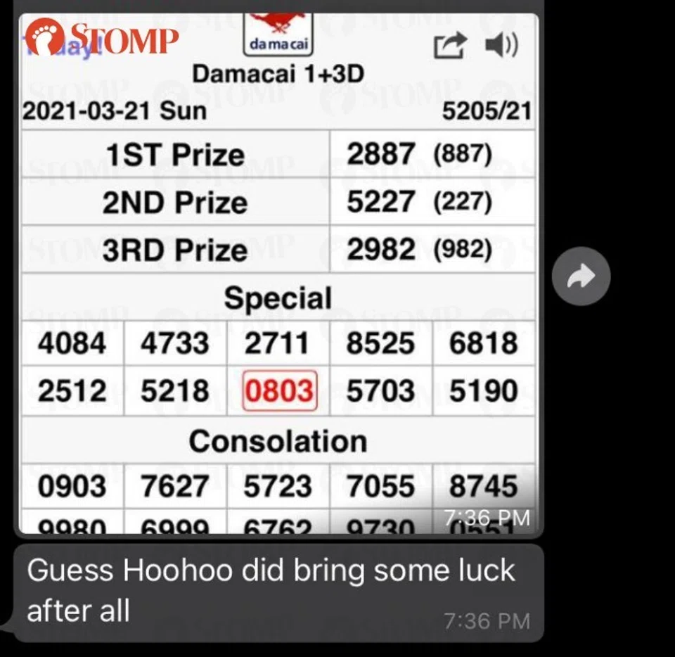 Terry's brother also tried his luck at 4D using his unit number on the day of Hoohoo's arrival - and struck the lottery.
