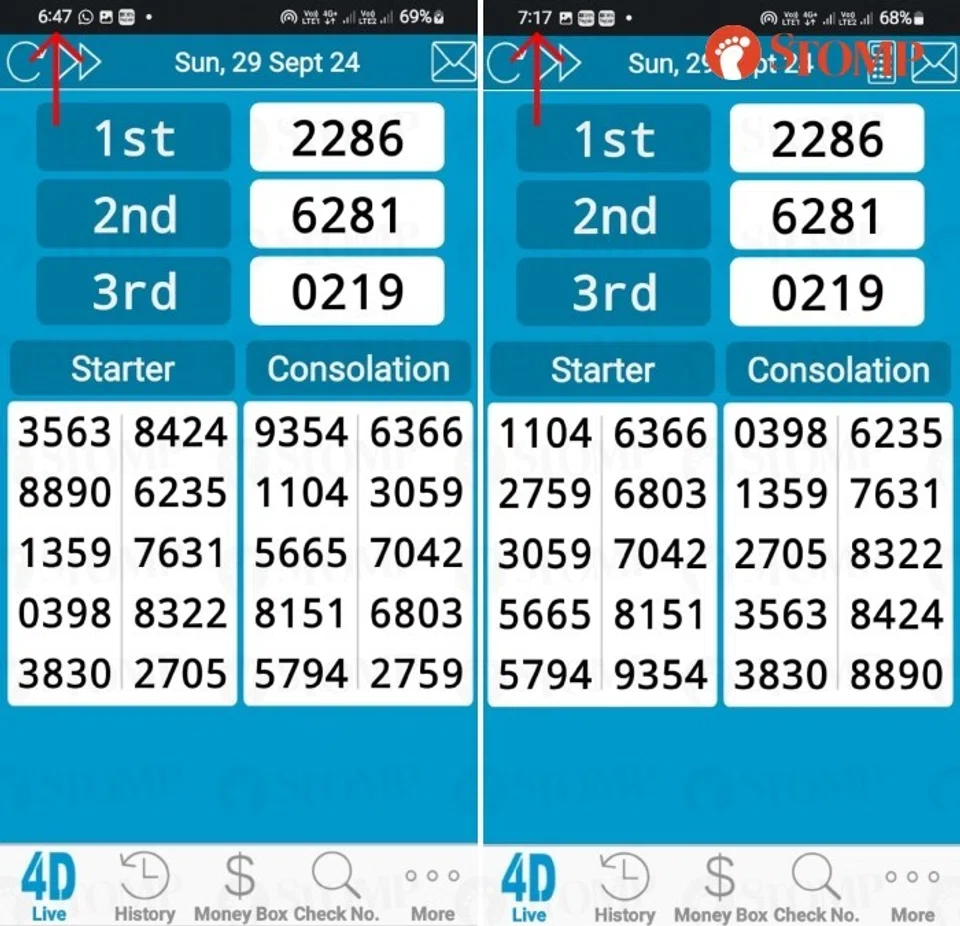 "Then later at 7.17pm, I logged in again and there was a new list of the days' 4D result," said the Stomper.