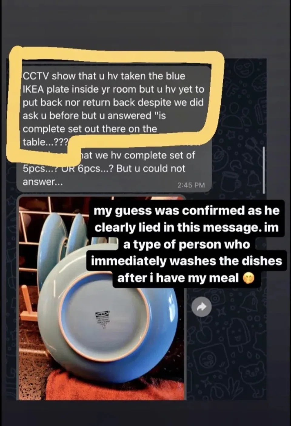 Later on, the landlord accused her of not returning a plate from the kitchen.