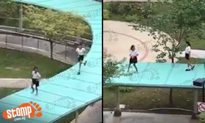 Gone are the days where "hanging out" meant flocking to the playground before heading home; these two girls took it to the next level and flirted with death by clambering onto and running on the roof of a walkway in Sengkang.