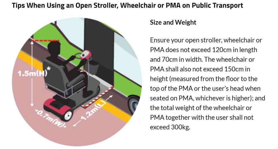 According to LTA, PMAs on public transport should not exceed 120cm in length, 70cm in width and 150cm in height.