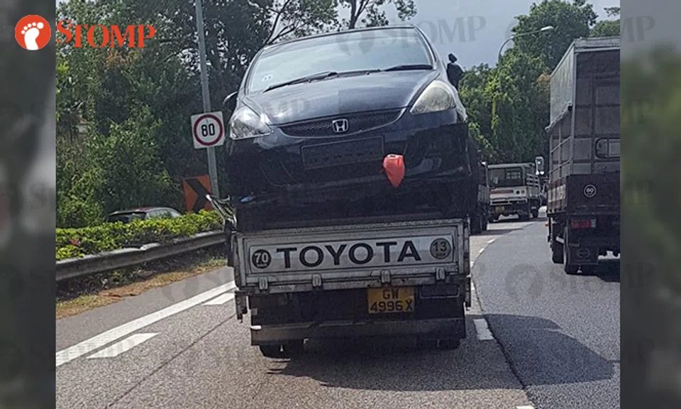 Stomper Vespa was concerned to see a Honda car being transported on the back of a pick-up truck along the Pan-Island Expressway (PIE) towards Tuas yesterday (March 1), at around 1pm.