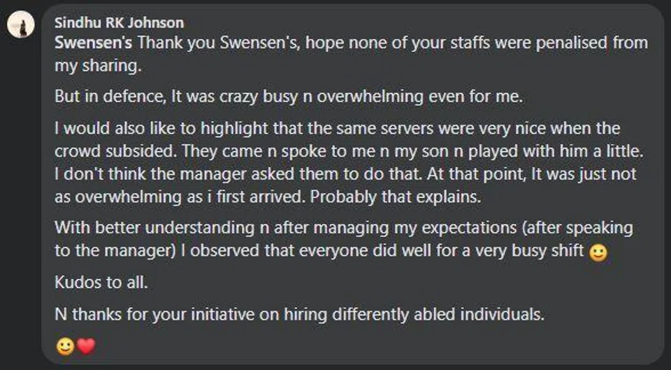 Restaurant chain Swensen's has thanked a customer for her viral Facebook post about the restaurant hiring people with special needs and how we should support them.