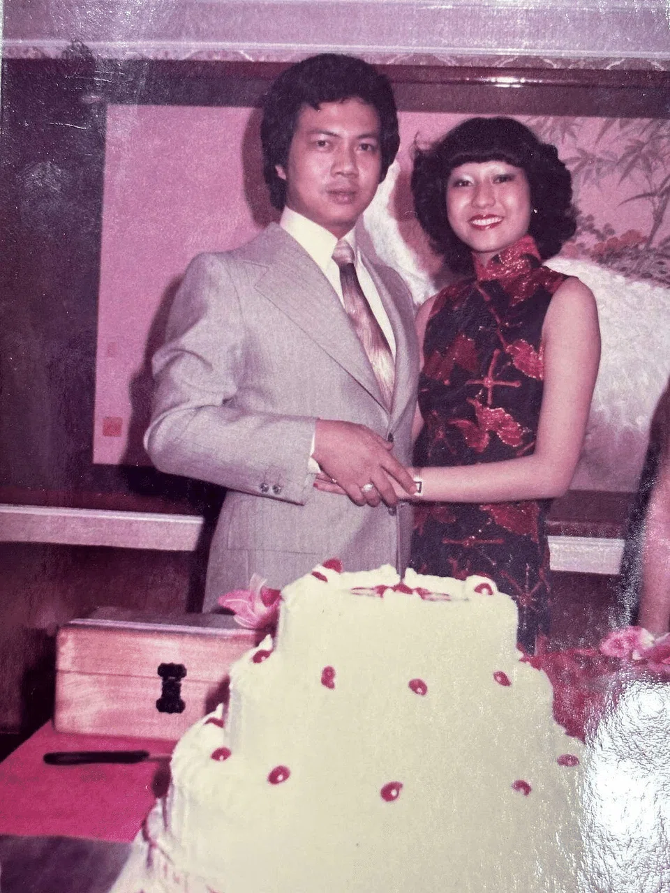 In another photo provided to ST, Ms Wang is seen in a red-and-black sleeveless cheongsam, embracing Mr Hsu’s father, who is sporting a grey suit.