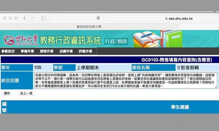 “Lacking? Your brain is empty… Out of 150 students you were the only one who said it is lacking… If you have the guts to, come out and say it! Shih Hsin has such classless students… After next semester’s classes end, I will never teach at Shih Hsin again!”