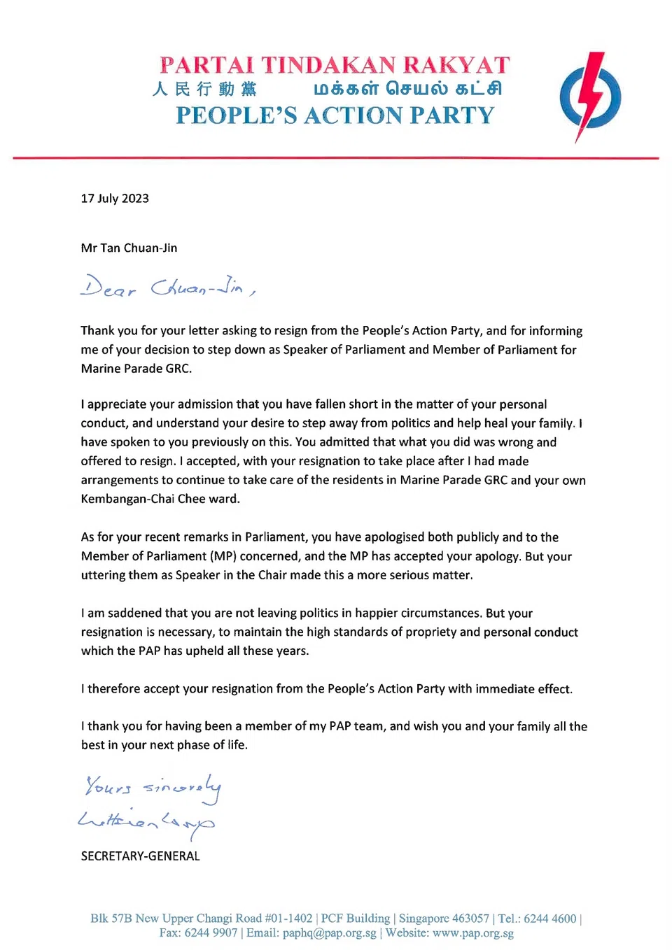 During the discussion, Mr Tan agreed to leave immediately both due to his unparliamentary conduct, as well as his inappropriate relationship with Ms Cheng.