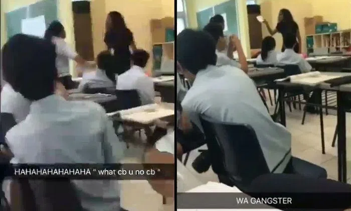 The caption on the first video says “what cb u no cb” and the teacher can be heard shouting vulgarities at the student, which Stomp has censored.