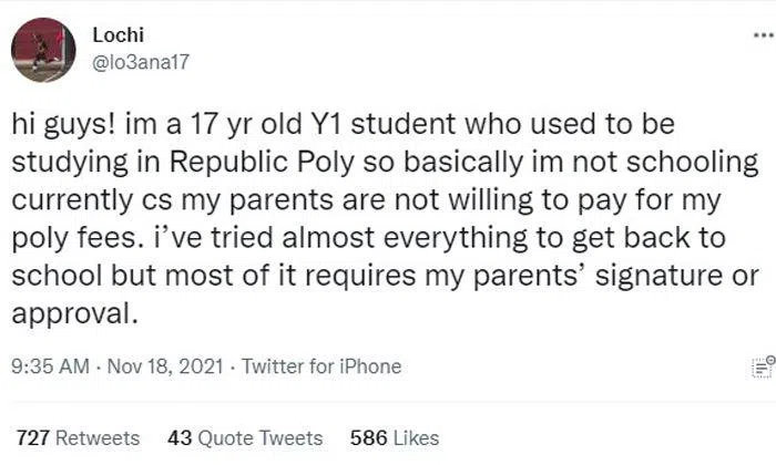 Twitter user @lo3ana17 wrote, "...so basically im not schooling currently (because) my parents are not willing to pay for my poly fees. I've tried almost everything to get back to school but most of it requires my parents’ signature or approval."