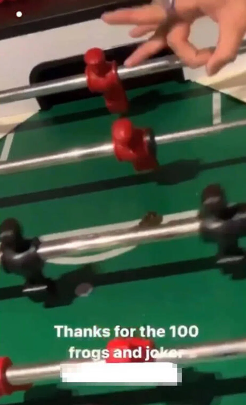 A screenshot of the incident showing three teens unboxing live frogs and playing foosball with a frog on the table. PHOTO: 取自/INSTAGRAM