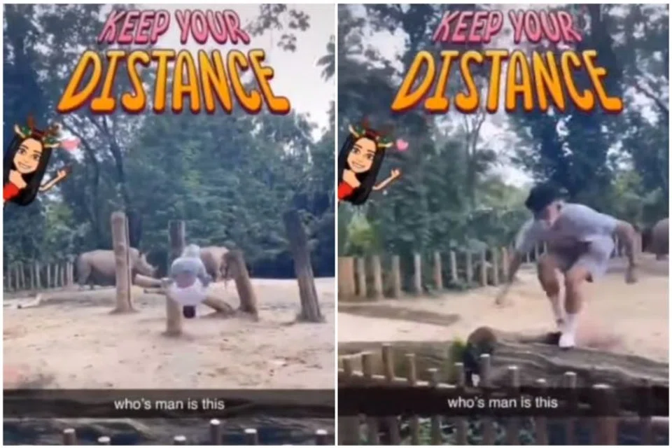 A TikTok video shows Ralph Wee Yi Kai doing a backflip in the rhino enclosure before running out. PHOTO: SCREENGRAB FROM YOUTUBE