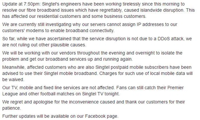 "Singtel advised customers to rely on their mobile data which they would waive for that day.