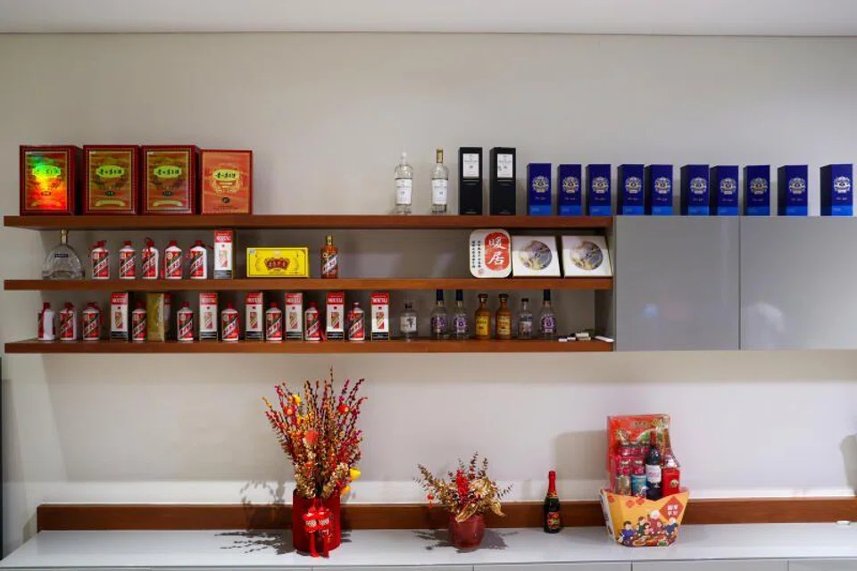More than 30 bottles of alcohol, including at least 15 bottles of Moutai, a Chinese liquor that costs about $500 to $600 a bottle, were displayed on a shelf.PHOTO: LIANHE ZAOBAO