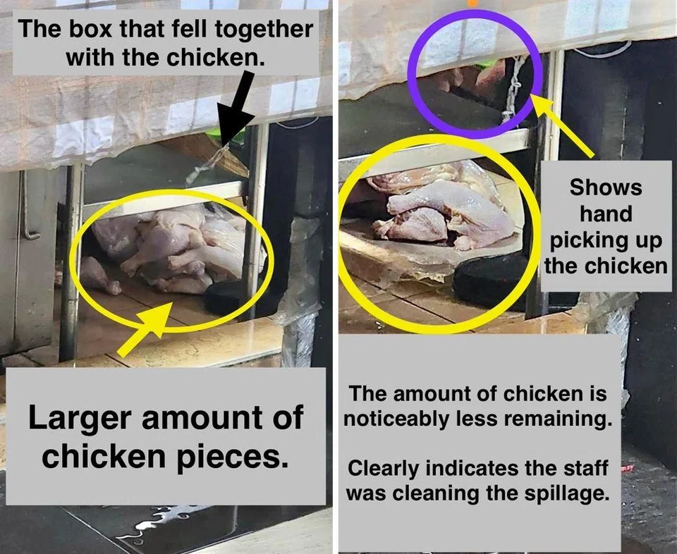 "You can see one image showing part of a box and a larger amount of chicken spilled. In the next photo, the staff is seen picking up the fallen chicken, with noticeably less remaining."