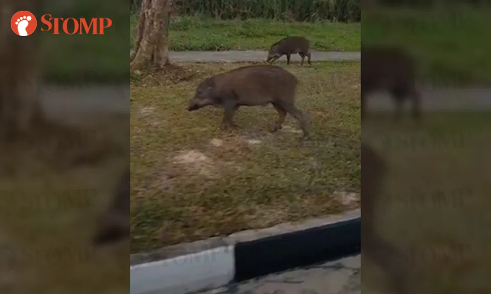 A pair of wild boars were caught on camera walking on a grass patch along Bukit Batok Road before the junction of Brickland Road on Oct 3 at about 6.45pm.