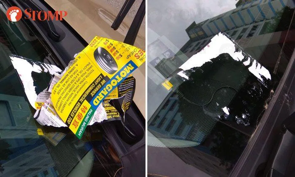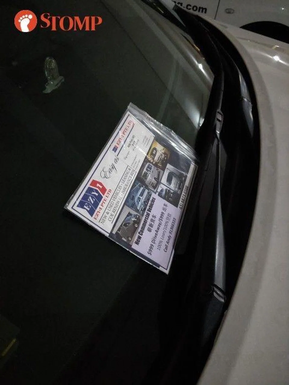 She told Stomp it reminded her of a Stomp article about a man who was frustrated when he found a flyer stuck to his car's windscreen.