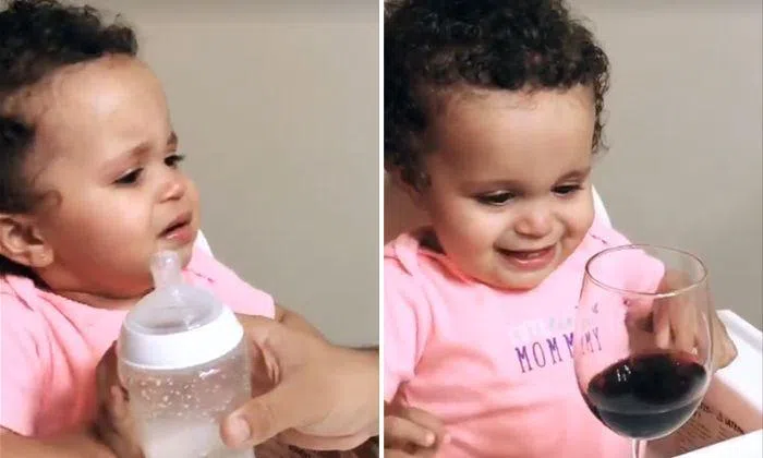 After a long day at the office, there is nothing better than lazing on a couch with a glass of wine in hand, and this adorable toddler could not agree more.