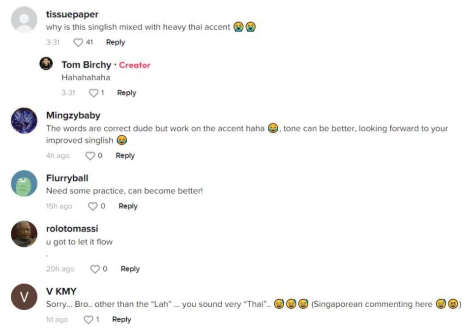 In a TikTok video uploaded on March 30, Tom Birchy, who grew up in Singapore and now resides in Thailand, tried his hand at the local patois, at the request of a commenter.