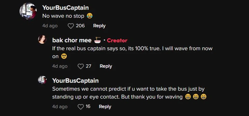 A TikToker named YourBusCaptain, who is an actual SMRT bus captain, commented: "No wave, no stop."
