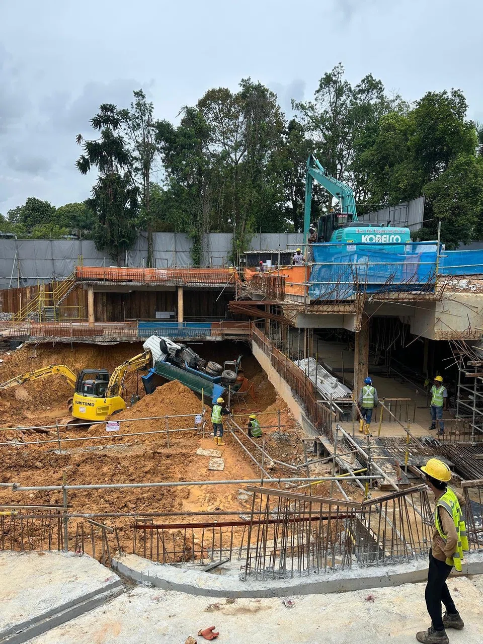 Photos of the accident were posted in the Complaint Singapore Facebook Group on April 10, showing the damaged truck on its side at the construction site. The truck appears to have landed on the arm of an excavator.