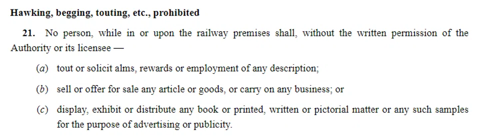 Rapid Transit Systems regulations state: "No person, while in or upon the railway premises shall, without the written permission of the Authority or its licensee, sell or offer for sale any article or goods, or carry on any business."