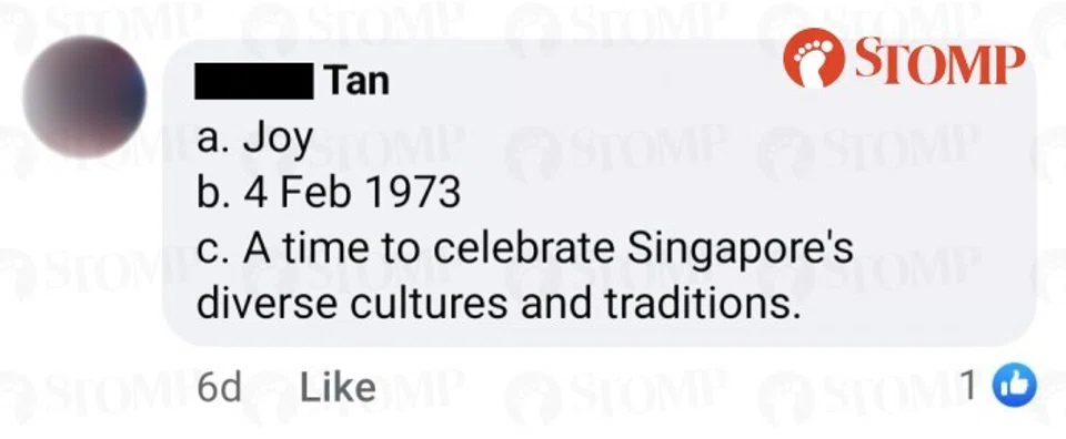 The winner from Facebook had answered the third question with nine words: "A time to celebrate Singapore's diverse cultures and traditions."