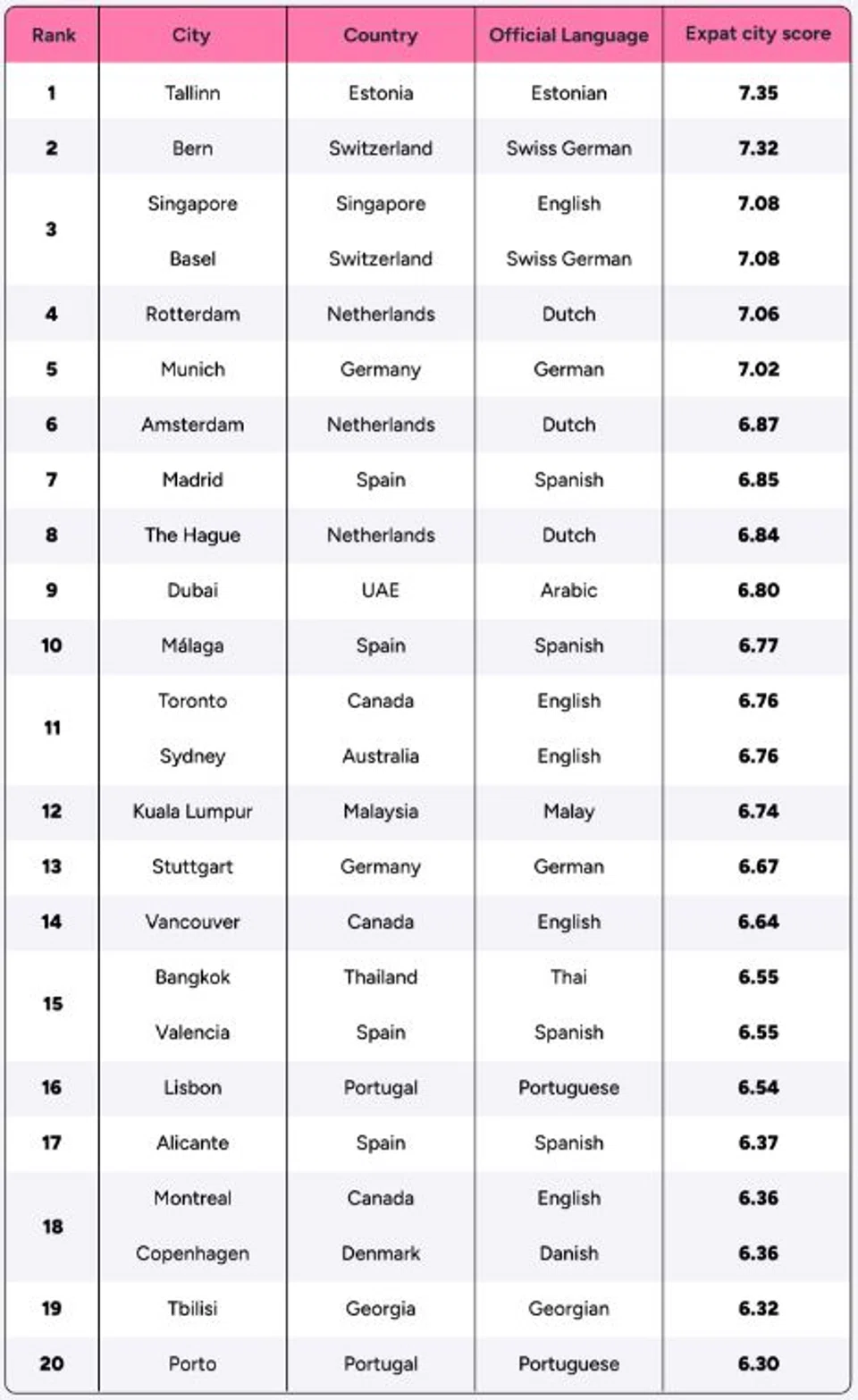 The top city is Talinn, Estonia, while No. 2 is Bern, Switzerland.