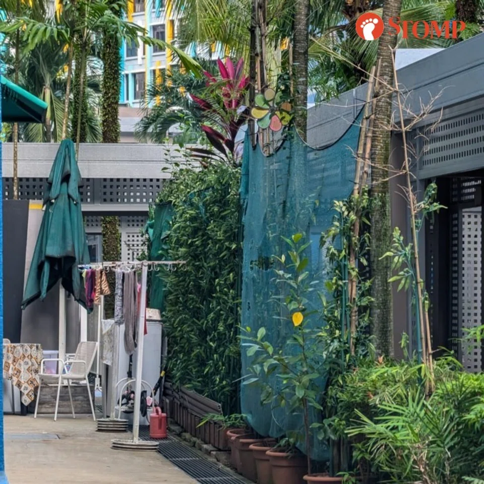 Stomper W shared photos of a table, chairs and a patio umbrella set up among the many potted plants on the ground floor of Block 473 Segar Road.