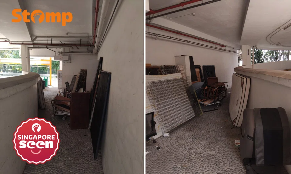 Stomper Ali shared photos showing bulky items such as furniture panels, metal frames, boards and other discarded materials stacked along a passageway within the carpark.