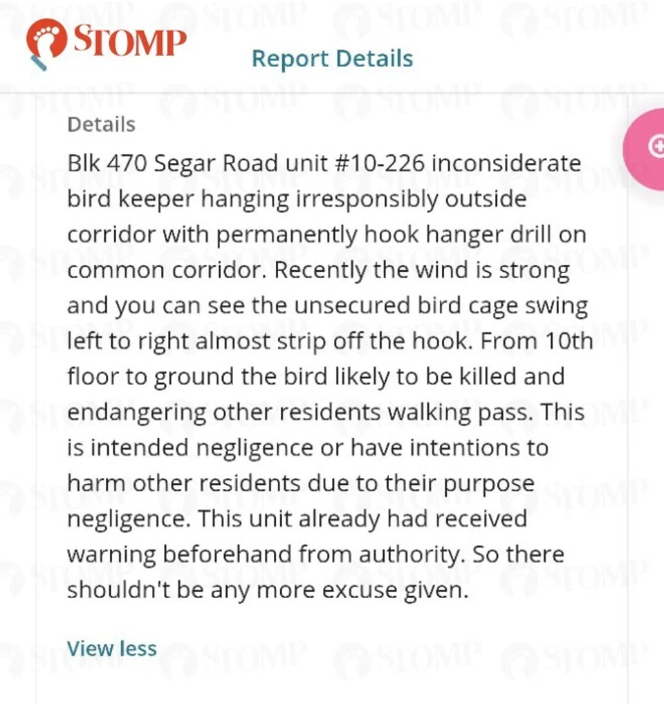 Stomper W expressed worry for the bird in the cage as well as for the safety of residents.