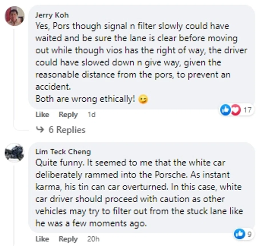 Although some netizens said the Porsche driver should have waited for the lane to be clear, many slammed the Vios for not slowing down and giving way.
