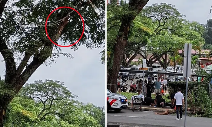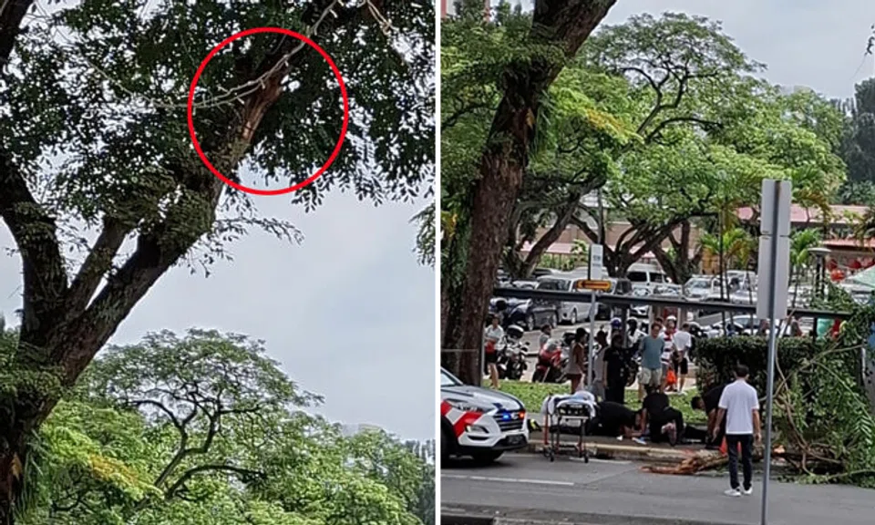 According to Chinese-language news outlet Shin Min Daily News, the incident occurred in front of the Redhill Market and Food Centre. The branch reportedly had a diameter of about 16cm.