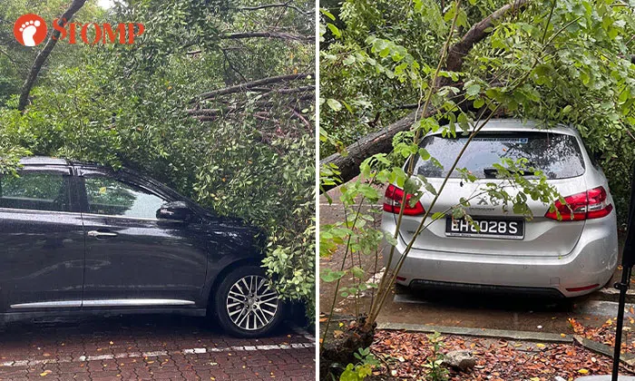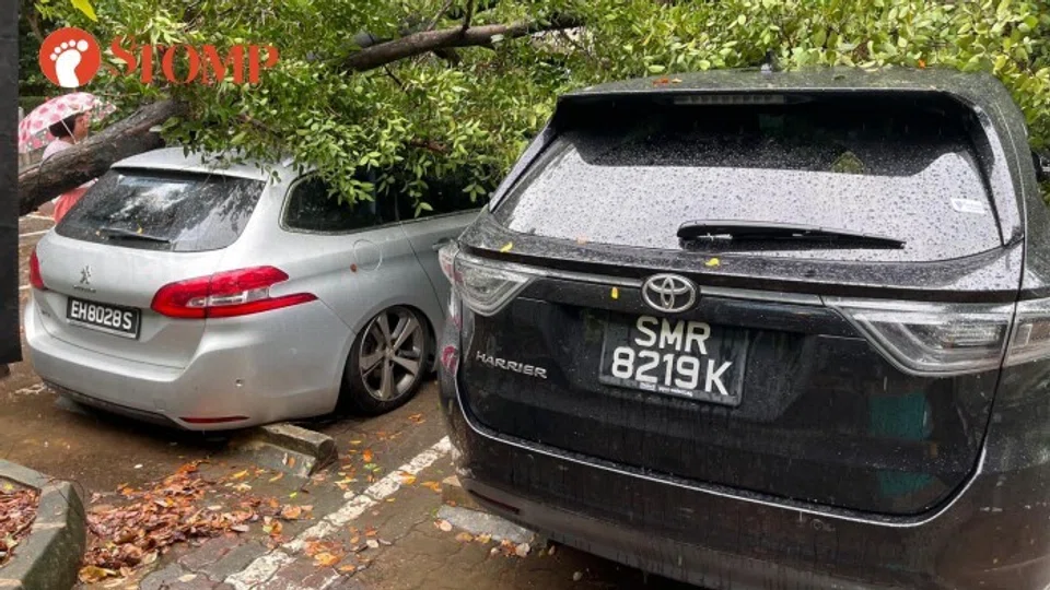 Tree uprooted by heavy rain falls onto parked cars at Punggol Park