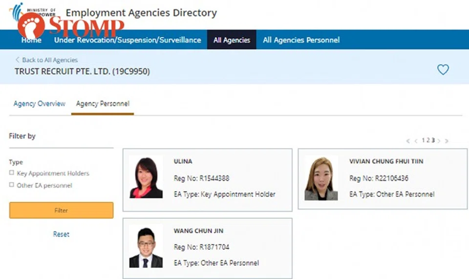 The names and photos of Trust Recruit's employees can be found by searching the Employment Agencies Directory on the Ministry of Manpower's website.
