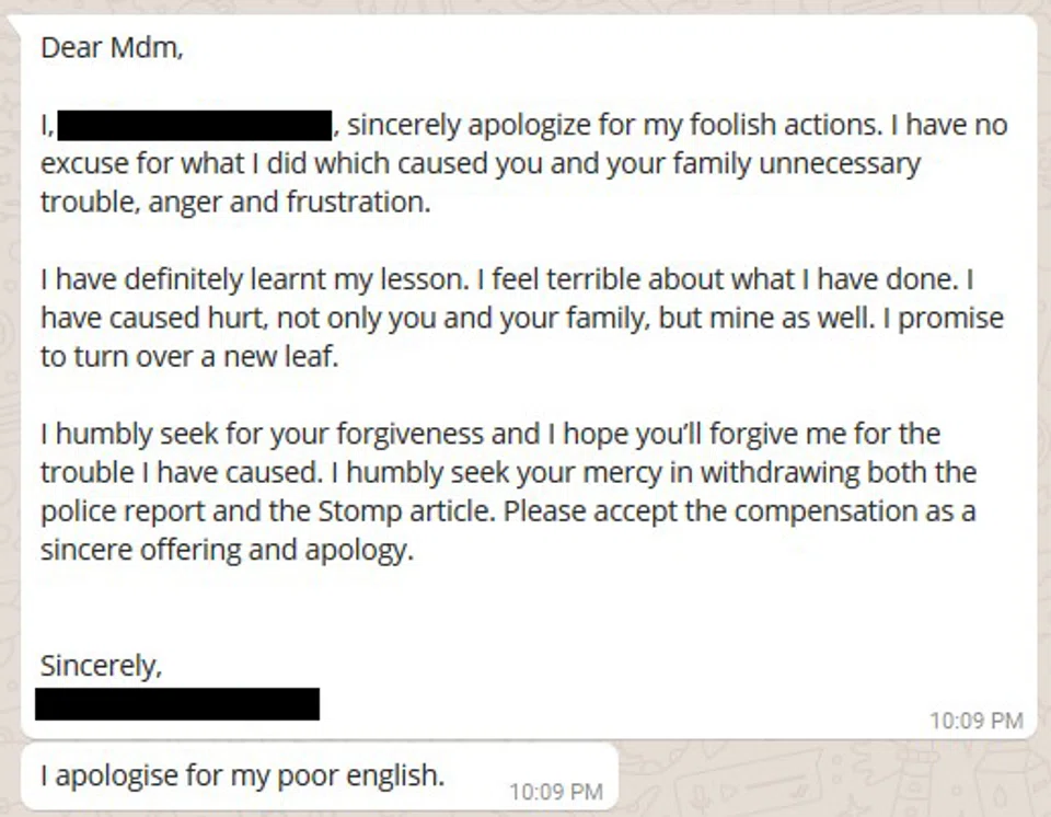 Dear Mdm, I, (name withheld by Stomp), sincerely apologize for my foolish actions. I have no excuse for what I did which caused you and your family unnecessary trouble, anger and frustration. I have definitely learnt my lesson. I feel terrible about what I have done. I have caused hurt, not only you and your family, but mine as well. I promise to turn over a new leaf. I humbly seek for your forgiveness and I hope you'll forgive me for the trouble I have caused. I humbly seek your mercy in withdrawing both the police report and the Stomp article. Please accept the compensation as a sincere offering and apology. Sincerely, (name withheld by Stomp)