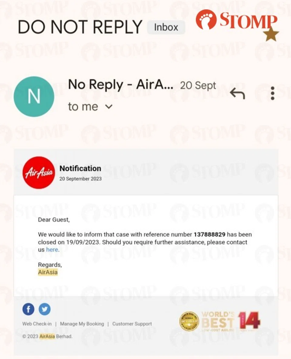 He told Stomp: "Our case has since been closed unilaterally by AirAsia without a satisfactory resolution and I am quite shocked at their level of customer service and lack of engagement on the issues raised."