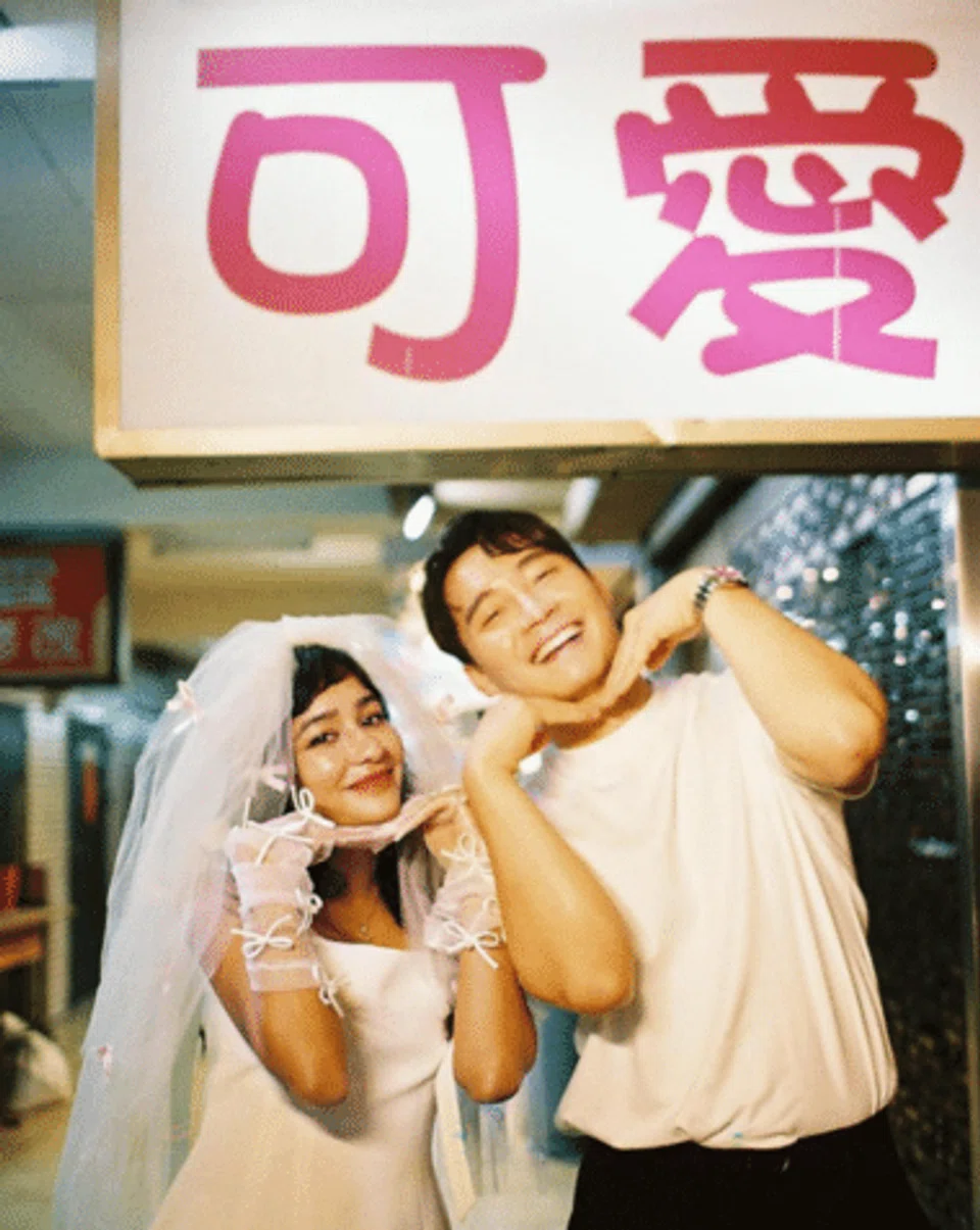 In the pictures, the couple go through several sets of outfits. One set sees the bride-to-be sporting a sleeveless midi-length white dress with a veil decorated with bows, while Ng wears a white T-shirt with a black blazer and black pants. In another, she is wearing a brown dress while he is in a short-sleeved button-down shirt.