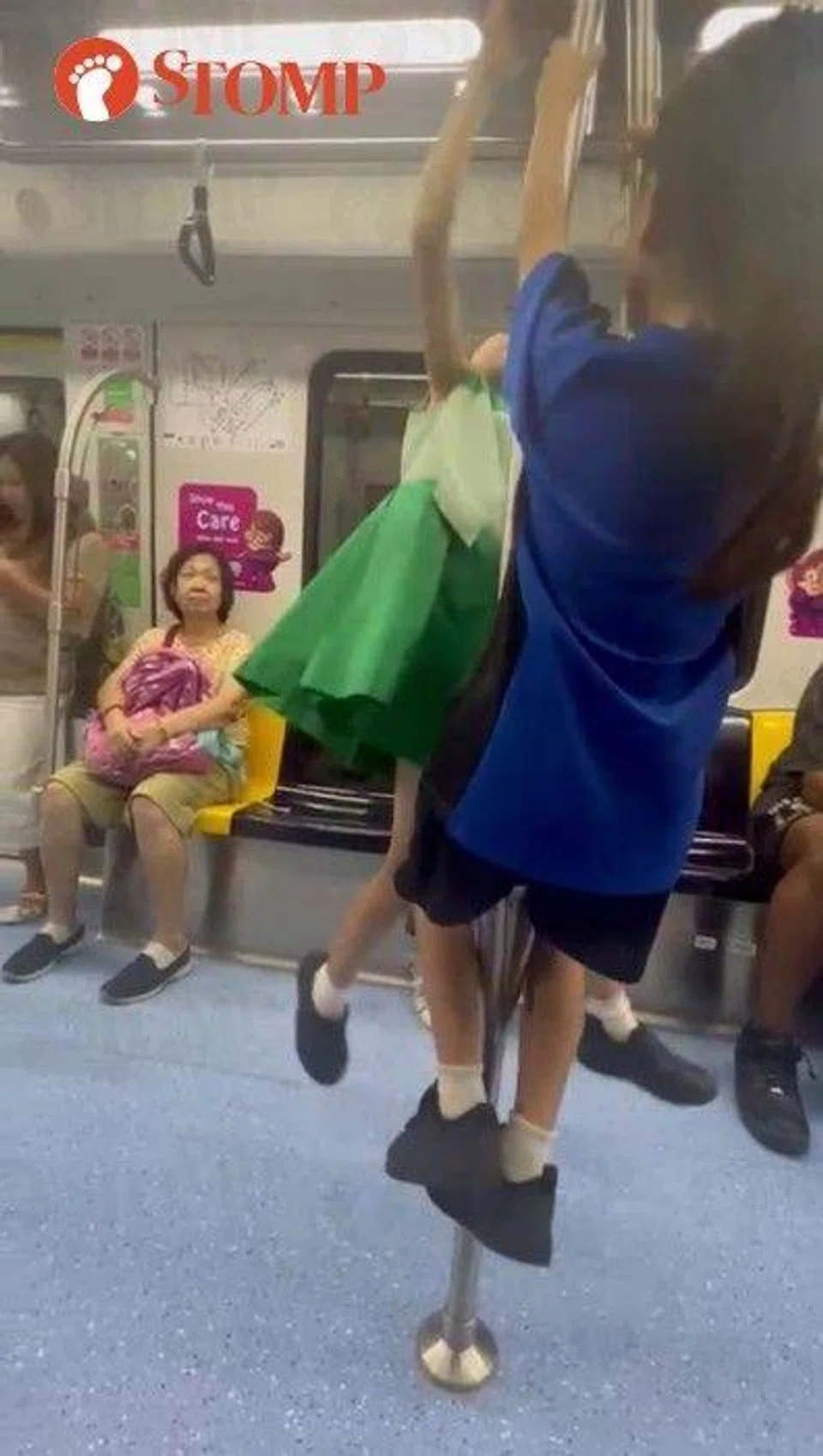 'Unruly' kids swing from handrails on MRT train despite commuter telling them to stop