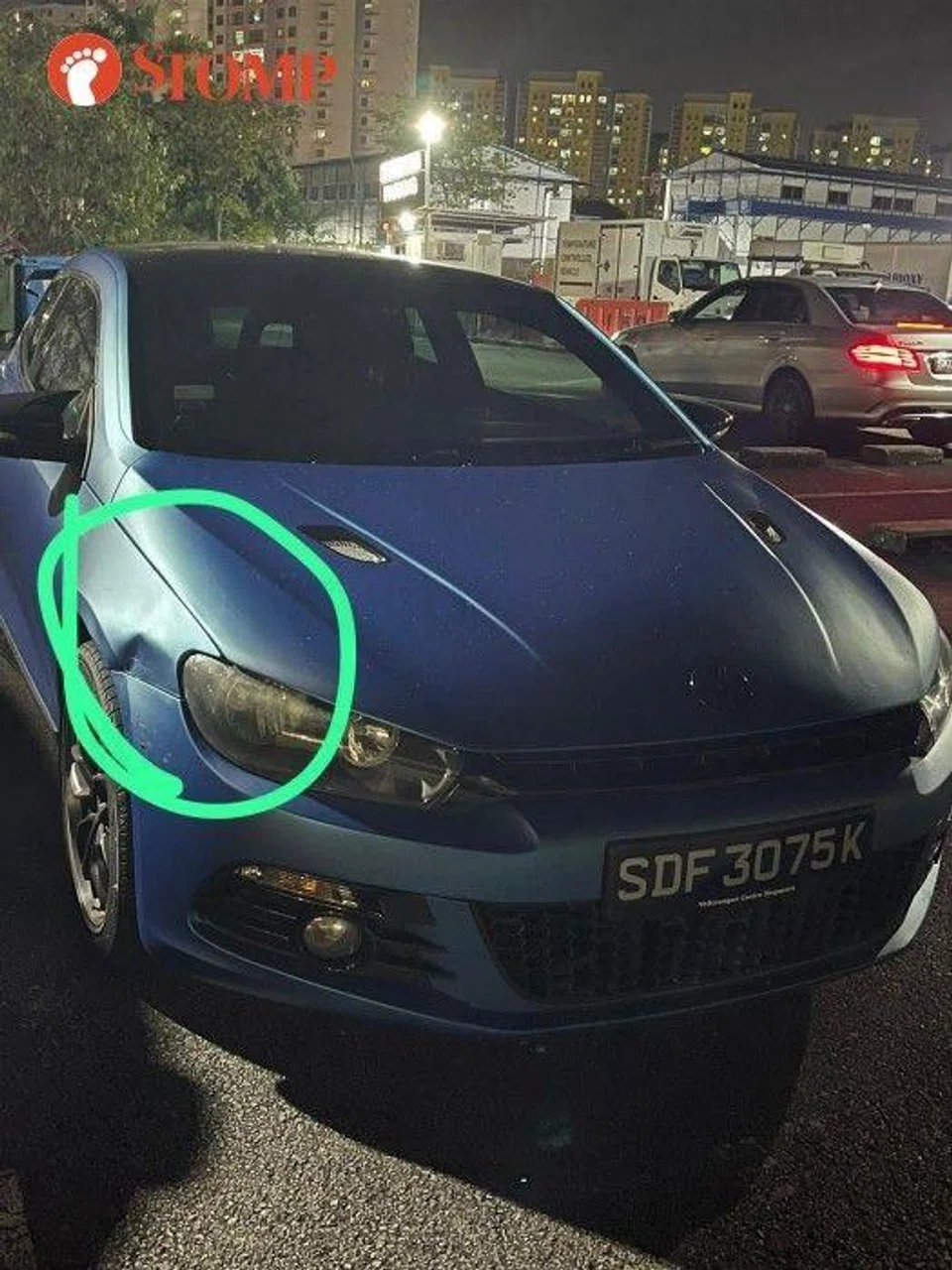 Stomper Ko Ko, who saw the hit-and-run accident, shared a photo of the blue Volkswagen Scirocco with a dent behind the right front headlight.