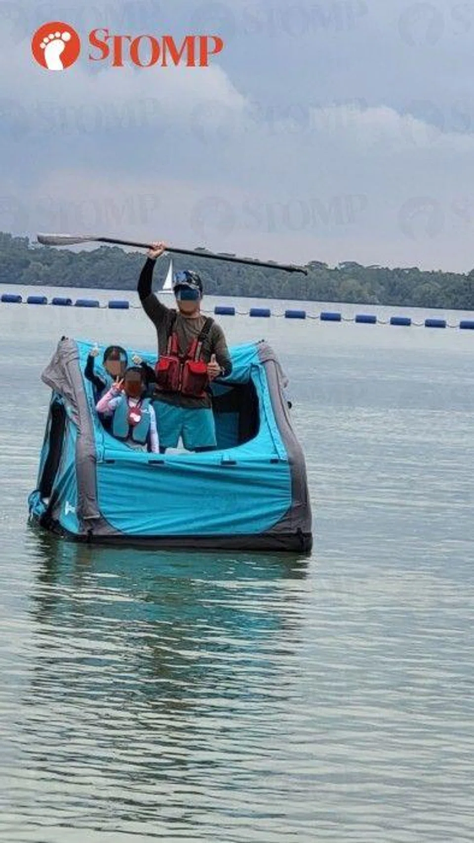 The photos show a man and two children in the floating tent.