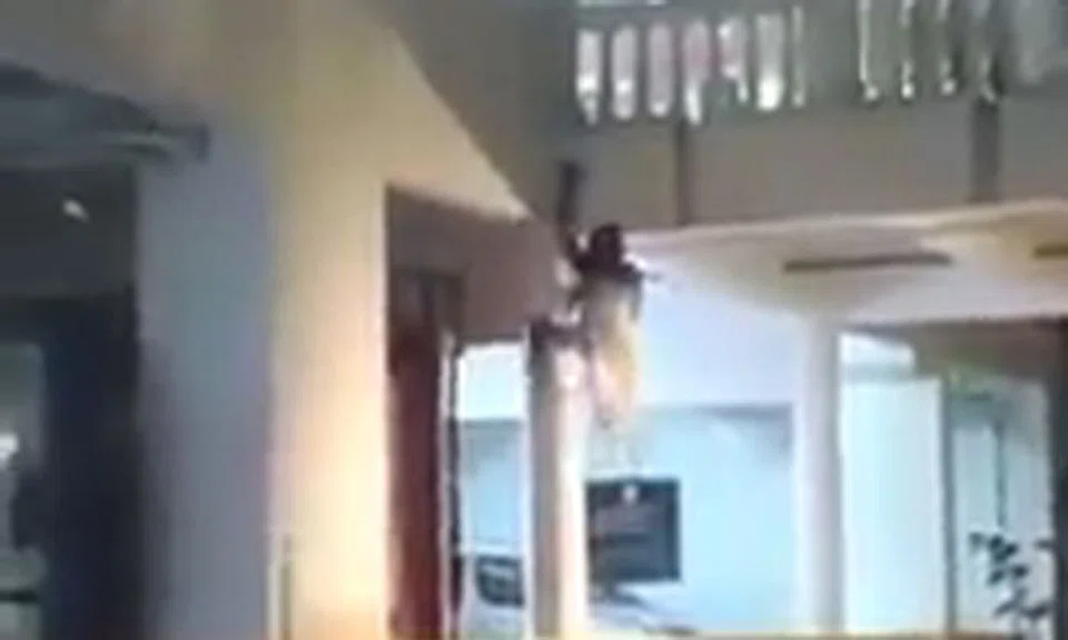 A video was posted on Kaki Share's Facebook page of a woman wearing white crawling up a pillar to get to the second floor of a building.