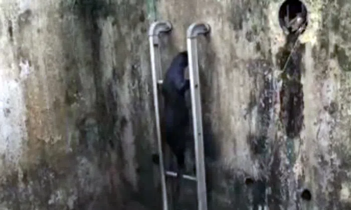 The clip, slightly longer than one minute, shows two adult-sized otters clamber up a metal ladder from a drain.