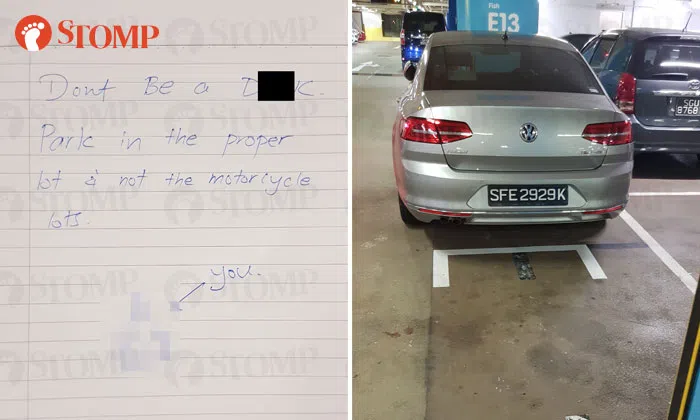 One Volkswagen driver incurred the wrath of stranger after he blocked two motorcycle lots at City Square Mall's carpark on Monday (Aug 12).