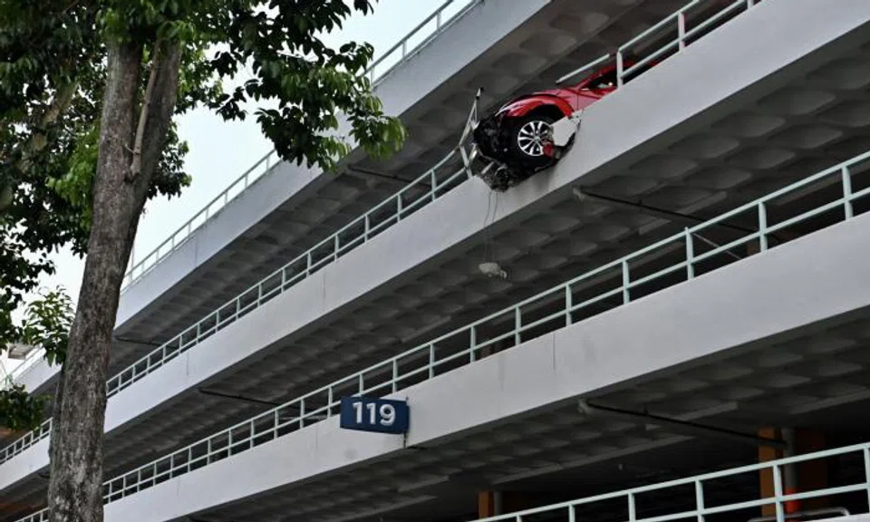 When The Straits Times visited the scene on Wednesday evening, the car was seen crashed through a wall and railings on the fourth storey of the carpark, with its front wheels and part of its bonnet hanging precariously over the edge.