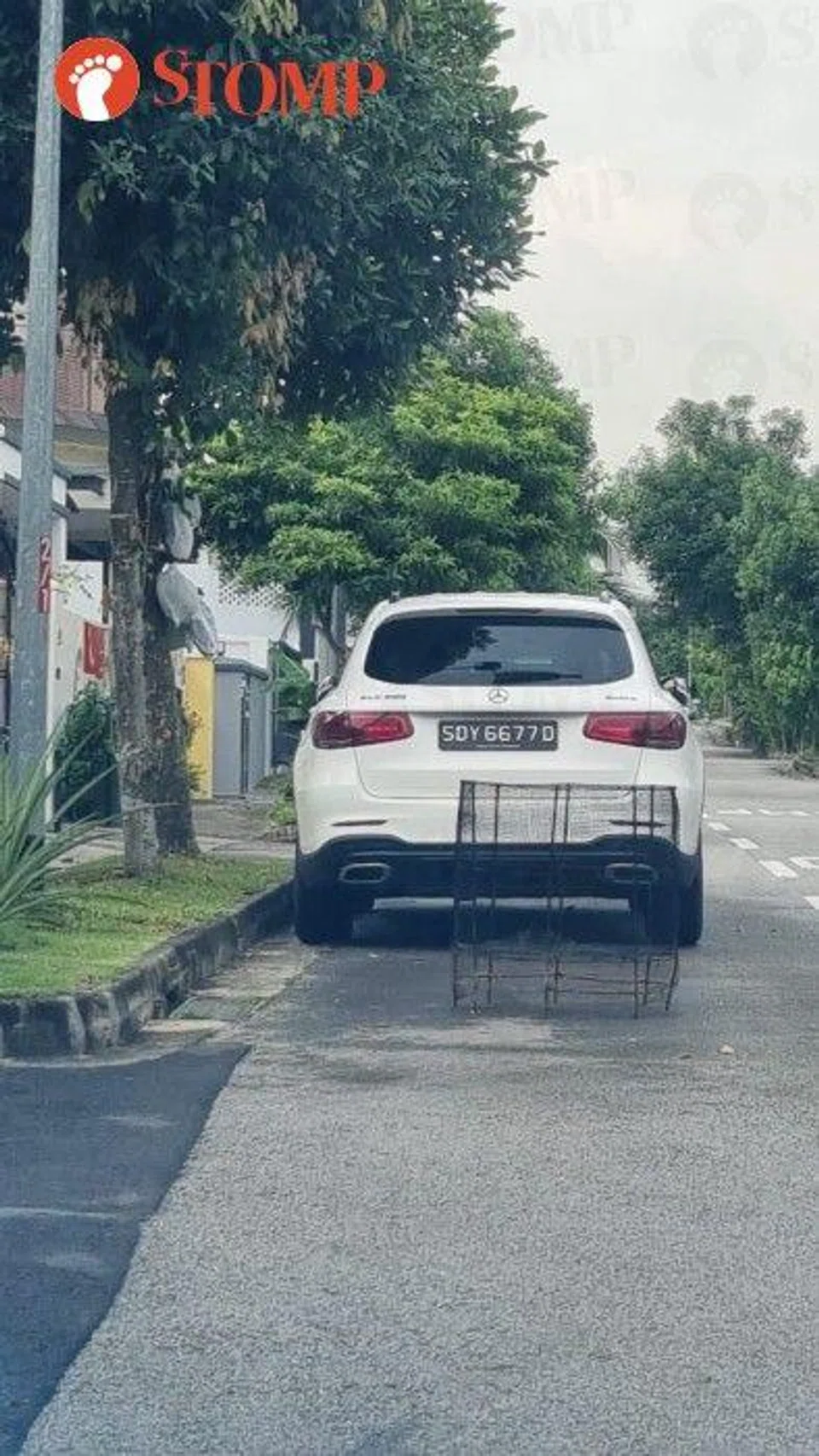 A Stomper shared photos of a cage-like object on the side of the road behind a white Mercedes-Benz parked at Jalan Salang in Sembawang.