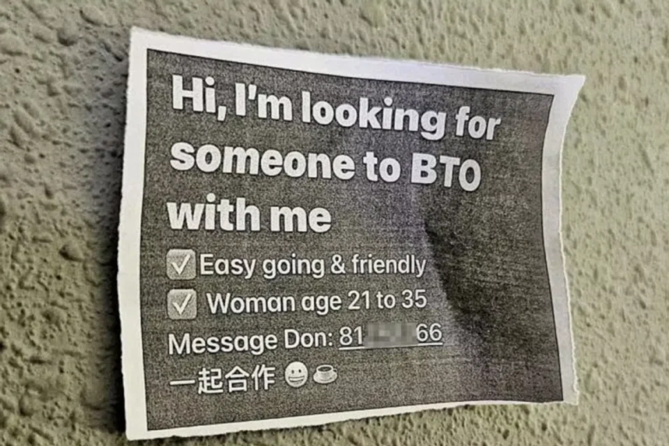 "Hi, I'm looking for someone to do BTO with me," he wrote on the sign. He had printed 18 copies of the sign and pasted them on walls and pillars in shopping malls near Woodlands MRT Station.