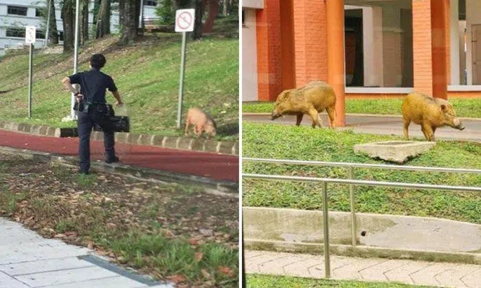 Two wild boars that wandered outside a Housing Board block were given the VIP treatment back to their natural habitat – by police officers.
