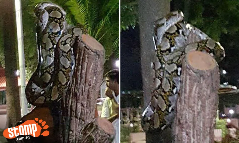 Stomper Dekgal and NurainiM saw a large reticulated python on a sign designed to look like a tree at Teban Gardens Park yesterday (June 27) night.